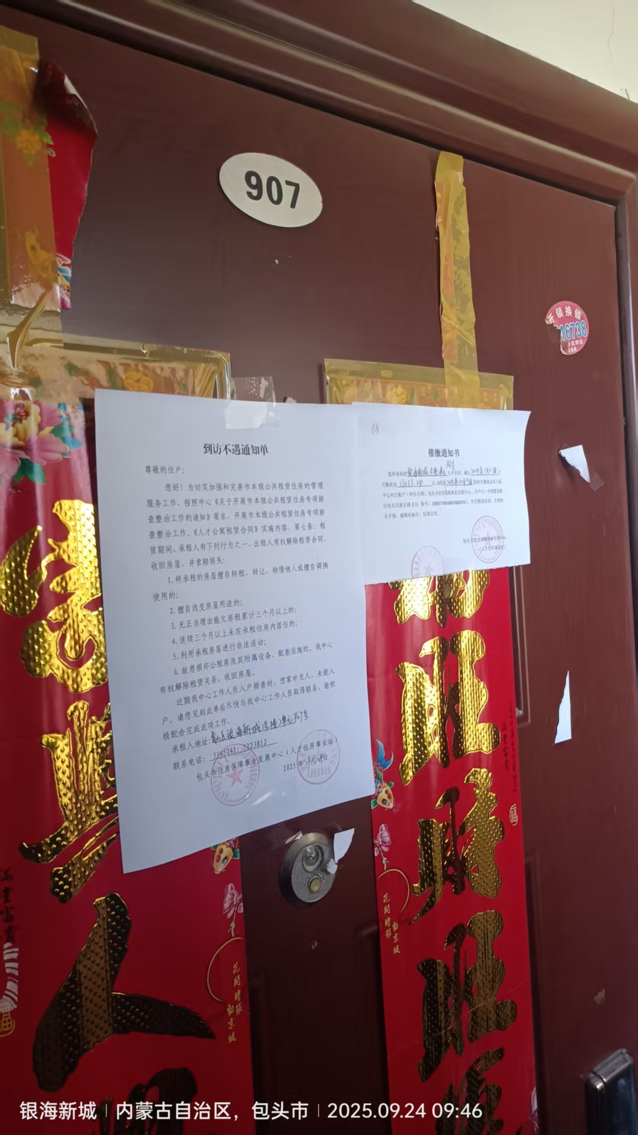 您所承租的银海新城1号楼2单元907室人才住房,截止2024年7月31日房屋租金13035.24,请您在本次公告送达后10日内将欠缴租金存入我中心对公账户(单位名称:包头市住房保障事业发展中心、开户行:中国建设银行包头民族东路支行 账号:15001716636052500254),并且腾退房屋,办理相关手续,逾期未执行,后果自负。
