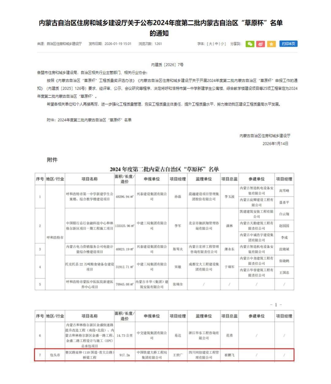 近日,内蒙古自治区住房和城乡建设厅正式公布2024年度第二批“草原杯”工程质量奖评选结果,由包头市住建局市本级政府投资非经营性项目代建中心承建的赛汉路桥梁工程,凭借过硬的工程质量、精湛的施工技艺、完善的管理体系及显著的社会价值成功上榜,摘得自治区建设工程质量最高荣誉。作为本次评选中包头市范围内唯一获此殊荣的工程项目,该工程不仅实现了从市级优质工程到省级标杆工程的跨越,更在包头市政基础设施建设领域树立起质量典范,为城市高质量发展写下浓墨重彩的一笔。