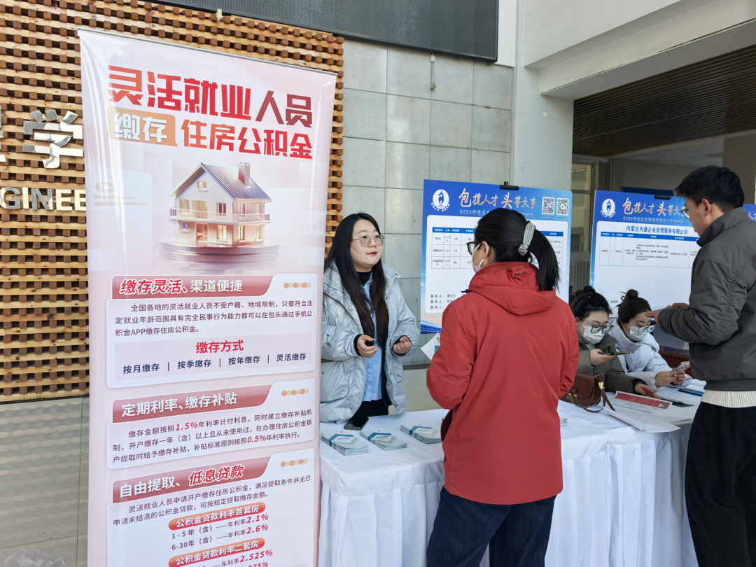 包头市住房公积金中心紧紧围绕服务“1144”现代化产业体系建设,找准定位,主动融入全市引才聚才大局,赋能企业发展、护航人才安居。近日,在市委组织部(市委人才办)牵头下,市人社局、内蒙古科技大学等单位联合组织的校园双选引才活动中,中心主动设点参展,现场为参会企业解读公积金政策,对大学生提供“一对一”咨询服务,将安居保障端口前移至毕业生择业一线,为全市产业发展和人才集聚提供政策支撑。