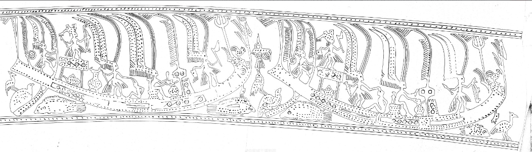 1983年,广州发现的西汉南越王墓中有一件铜提筒腹中间刻着四组相近的羽人船纹图案。