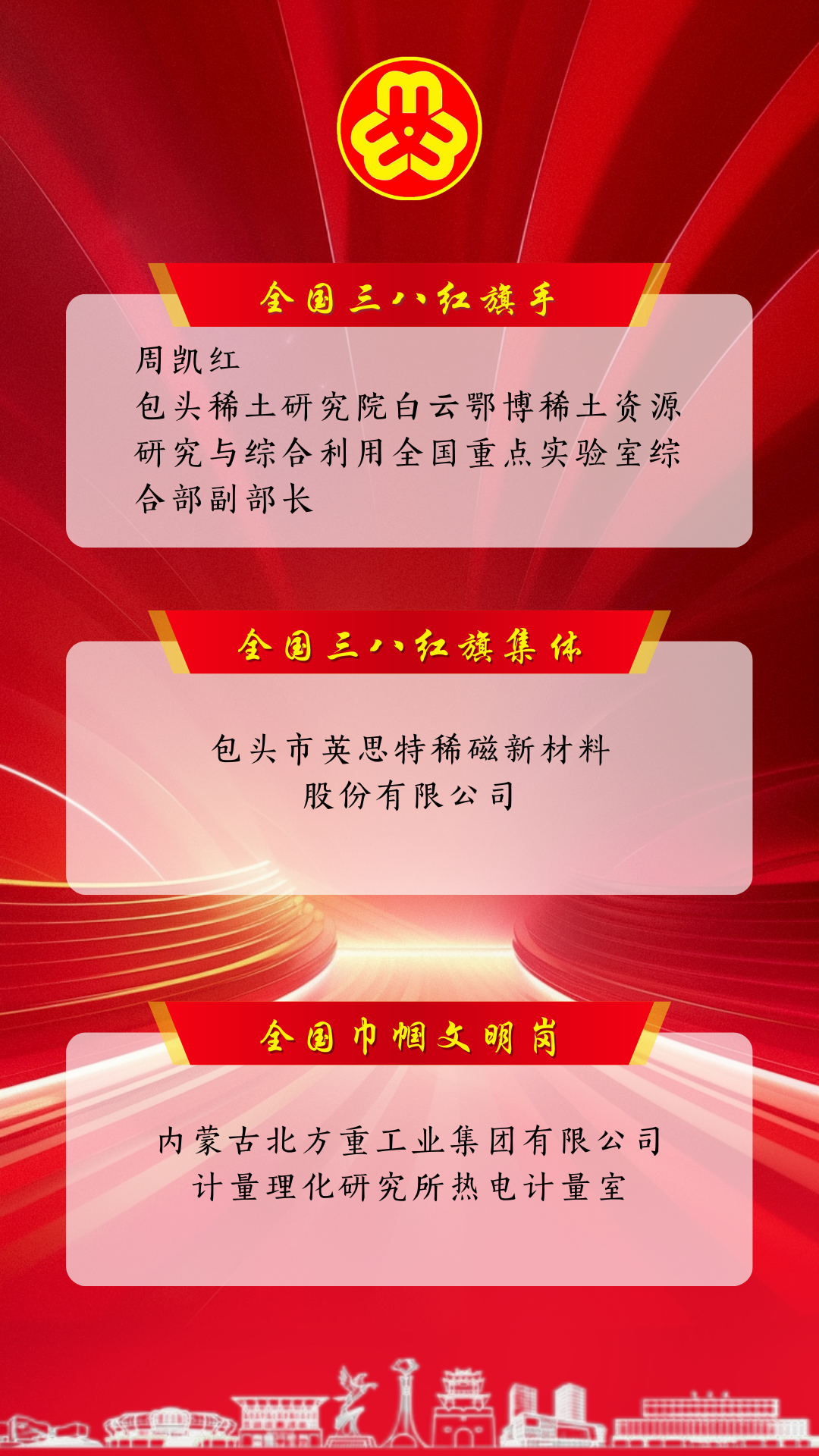 在第116个“三八”国际妇女节来临之际,全国妇联发布《关于表彰2025年度全国三八红旗手标兵、全国三八红旗手、全国三八红旗集体、全国巾帼文明岗的决定》,表彰一批女性典型和先进集体。包头市共有1人2集体上榜,其中,1人获得全国三八红旗手称号,1集体获得全国三八红旗集体称号,1集体获得全国巾帼文明岗称号。